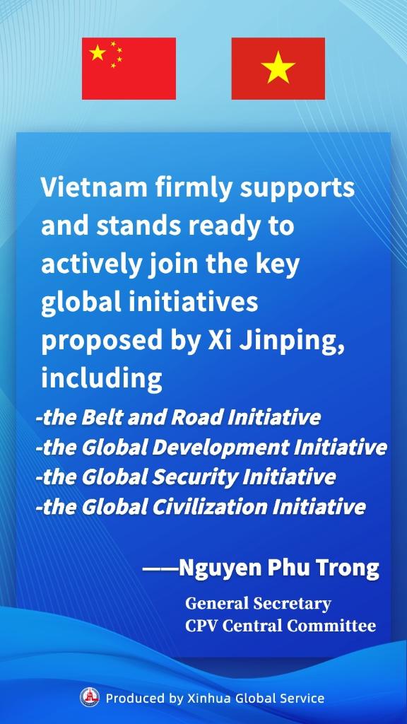 Vietnam firmly supports and stands ready to actively join key Chinese global initiatives, including the Belt and Road Initiative, the Global Development Initiative, the Global Security Initiative, and the Global Civilization Initiative, Vietnamese leader Nguyen Phu Trong said while meeting with visiting Chinese leader Xi Jinping.