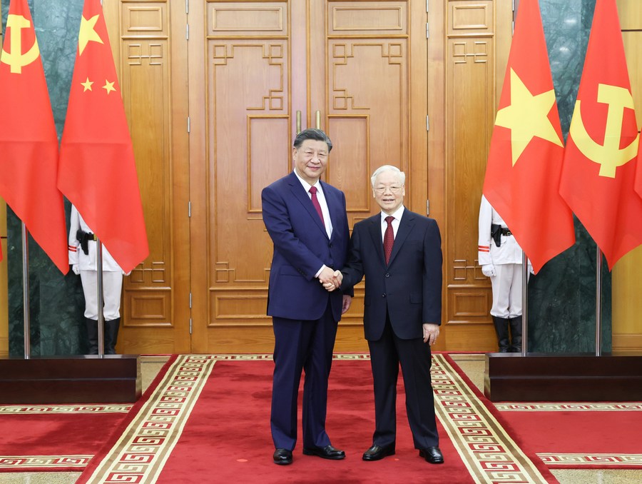General Secretary of the Communist Party of China Central Committee and Chinese President Xi Jinping holds talks with General Secretary of the Communist Party of Vietnam Central Committee Nguyen Phu Trong in Hanoi, capital of Vietnam, Dec. 12, 2023. Upon Xi's arrival in Hanoi, he had a meeting with Trong on Tuesday. (Xinhua/Pang Xinglei)