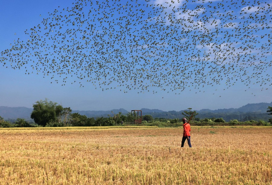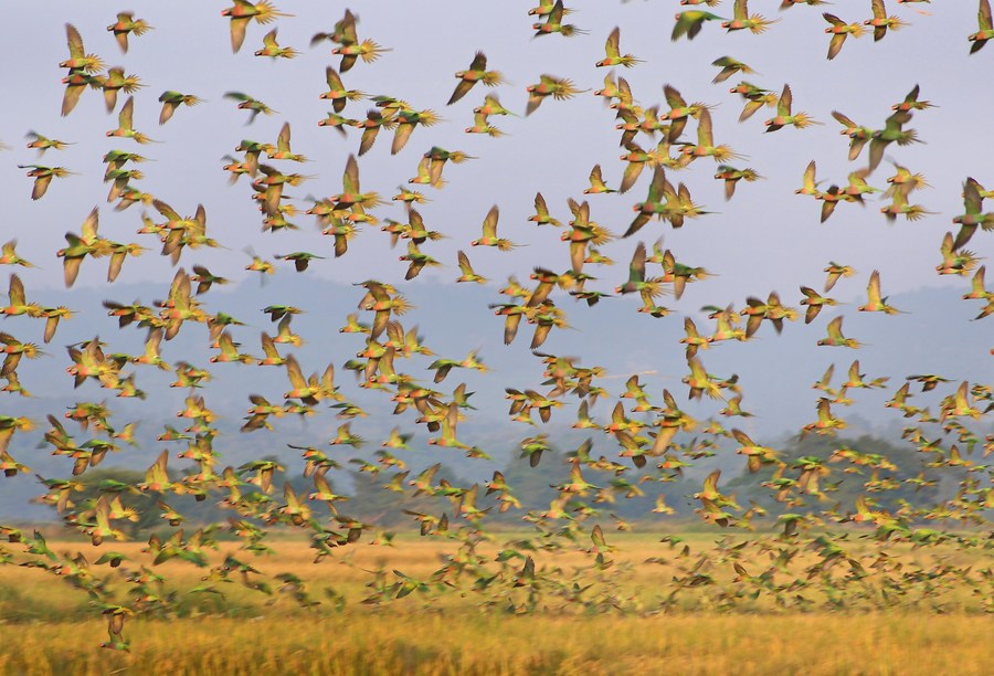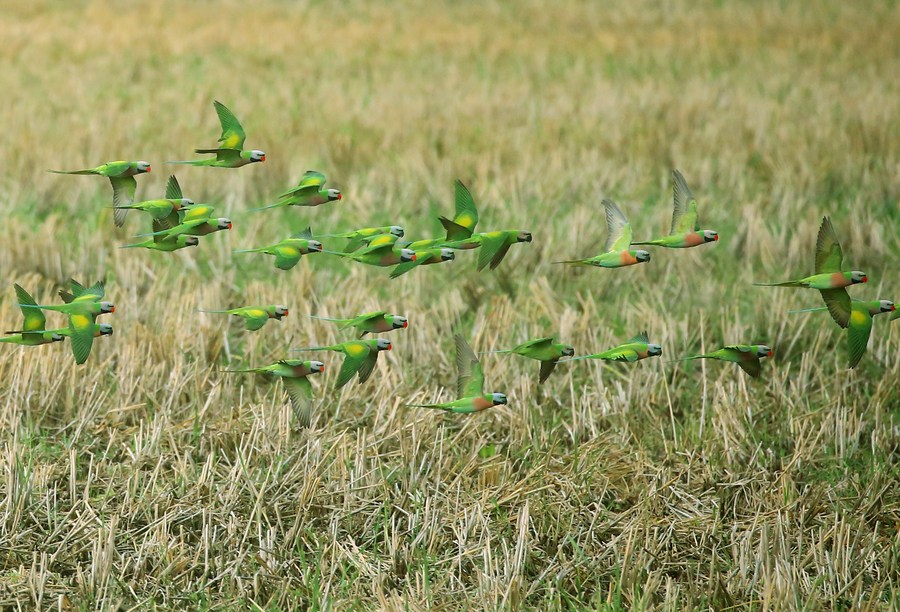 A flock of parakeets fly over a paddy field in Chattogram, Bangladesh on Dec. 10, 2023. (Photo by Salim/Xinhua)