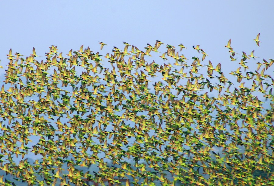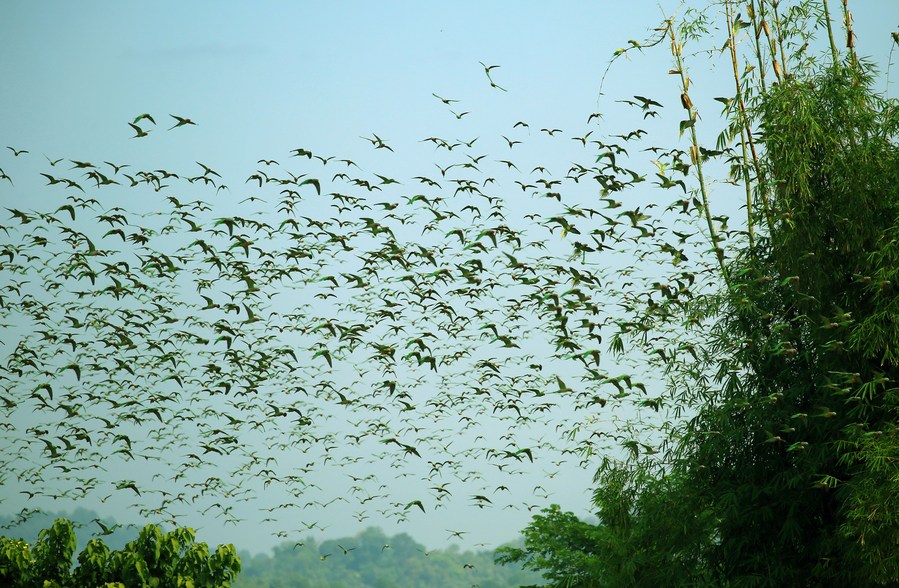 A flock of parakeets fly in the sky in Chattogram, Bangladesh on Dec. 10, 2023. (Photo by Salim/Xinhua)■