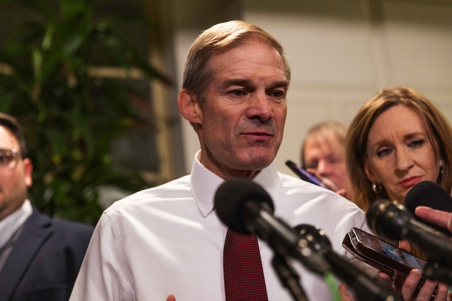 U.S. Right-wing Republican Jim Jordan (Front), chairman of the House Judiciary Committee, is seen in the Capitol building in Washington, D.C., the United States, on Oct. 16, 2023. (Photo by Aaron Schwartz/Xinhua)