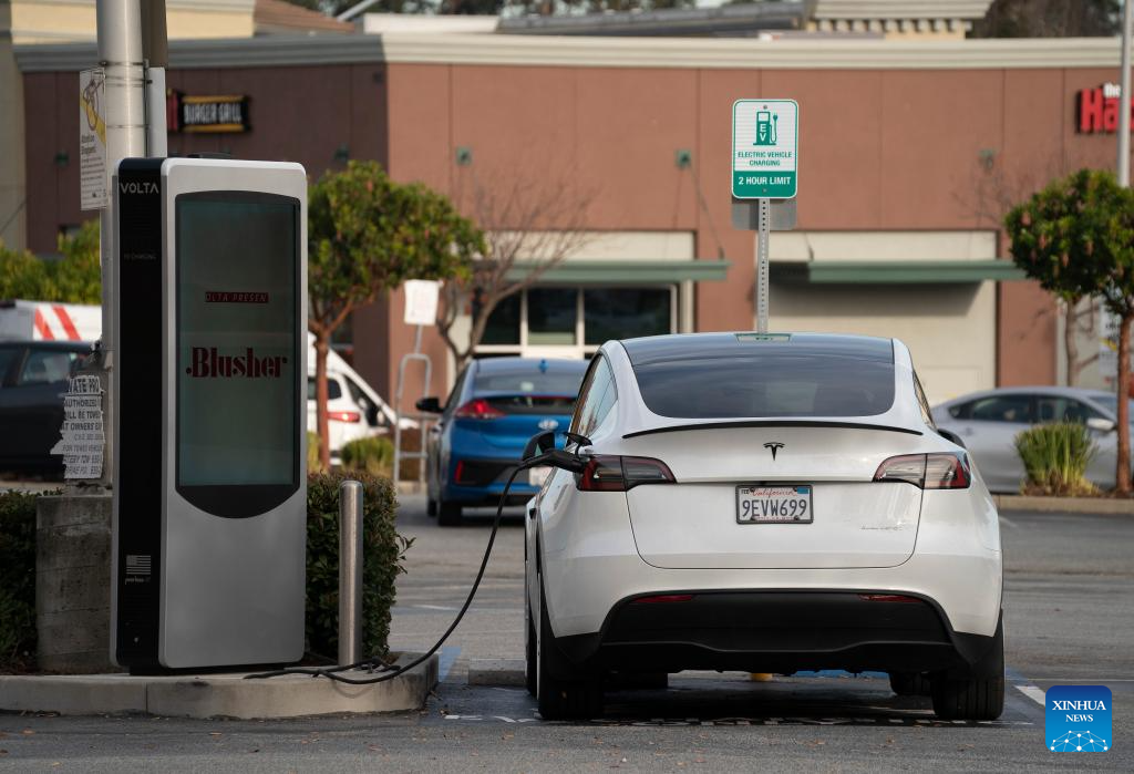 A Tesla car is charged at a parking lot in San Mateo County, California, the United States, Dec. 13, 2023. Tesla said on Wednesday the company is recalling more than 2 million of its vehicles over autopilot safety issues after an investigation found its autopilot safety system was "not sufficient to prevent driver misuse."