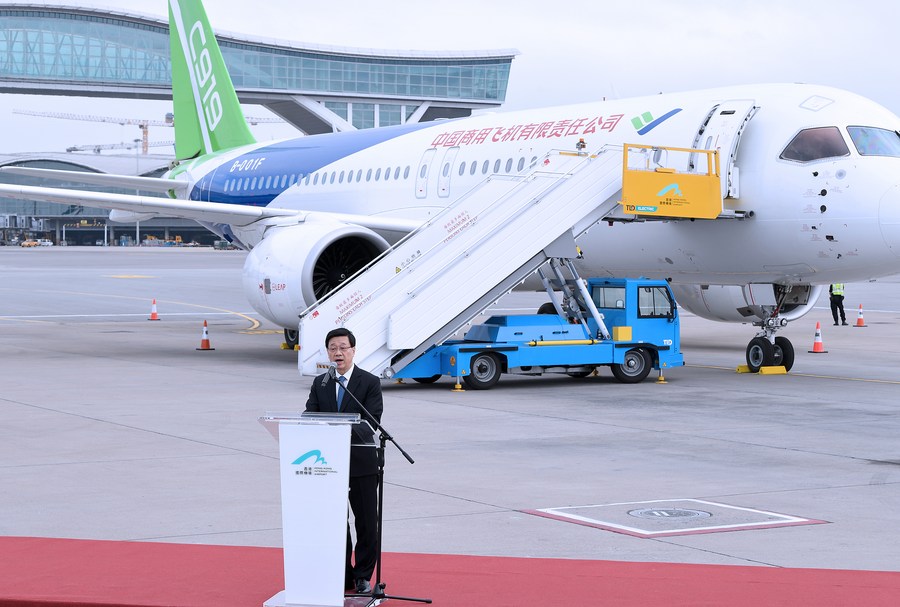 The two aircraft arrived at the Hong Kong International Airport on Tuesday afternoon. For C919, China's first homegrown large jetliner that has secured over 1,000 orders, it was its maiden flight outside the Chinese mainland.