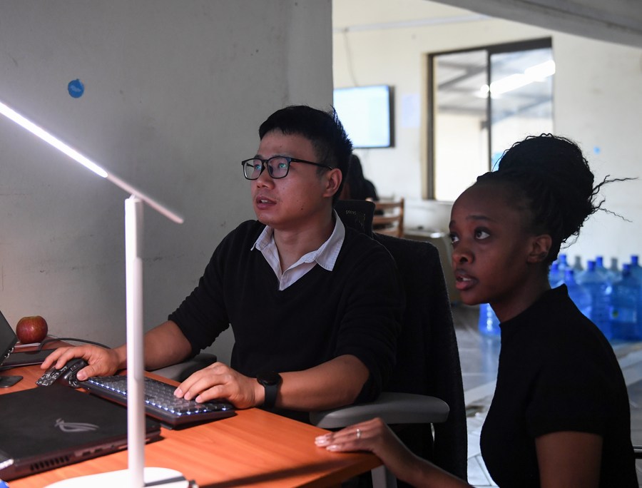 A Chinese staff member and a Kenyan colleague of Kilimall work at an office in Mlolongo, Kenya, Nov. 10, 2023. (Photo by Li Yahui/Xinhua)