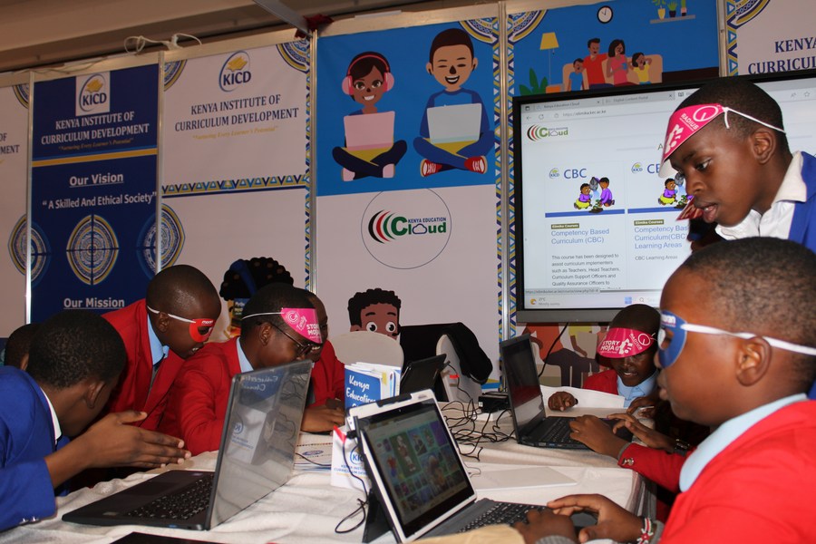 Children enjoy a digital learning experience during the 24th Nairobi International Book Fair at Sarit Center in Nairobi, capital of Kenya, on Sept. 27, 2023. (Photo by Chrispinus Omar/Xinhua)
