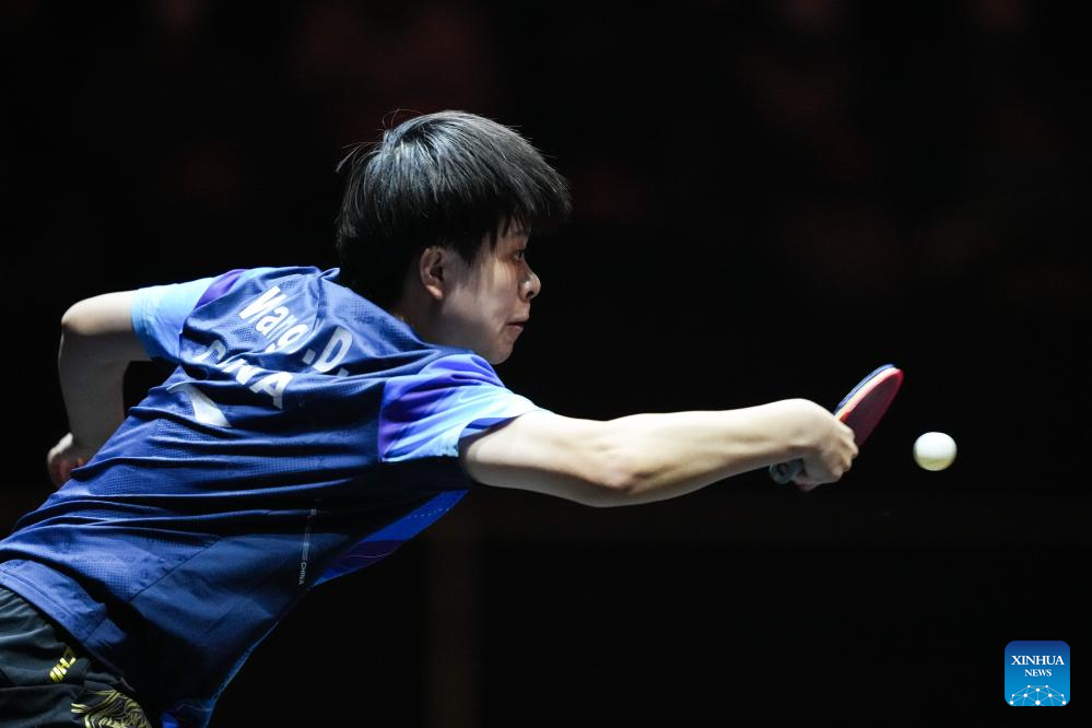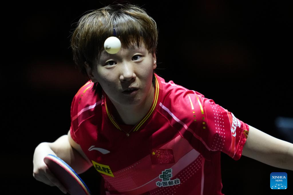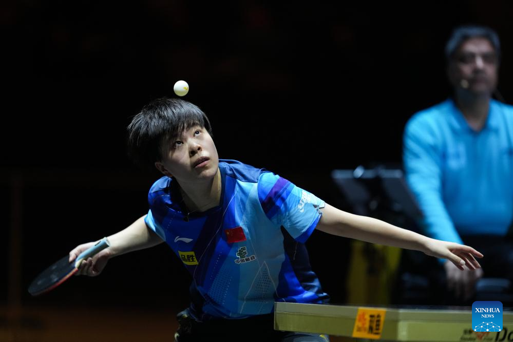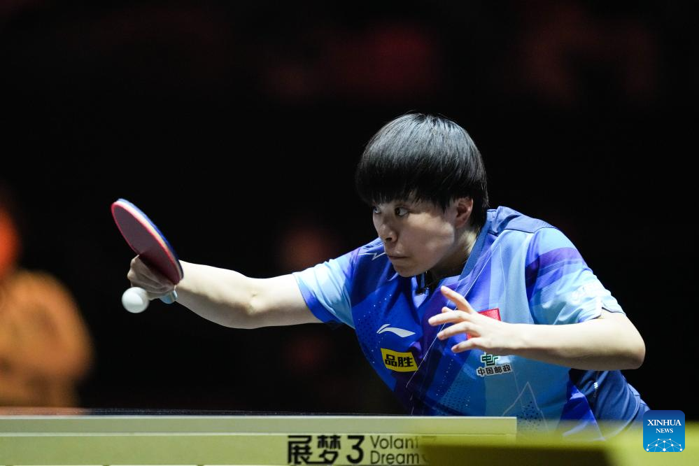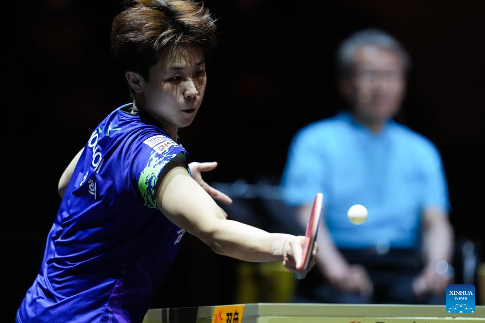 Wang Yidi of China returns the ball during the women's singles round of 16 match against Shin Yubin of South Korea at the WTT Finals Women Nagoya 2023 in Nagoya, Japan, on Dec. 15, 2023. (Xinhua/Zhang Xiaoyu)