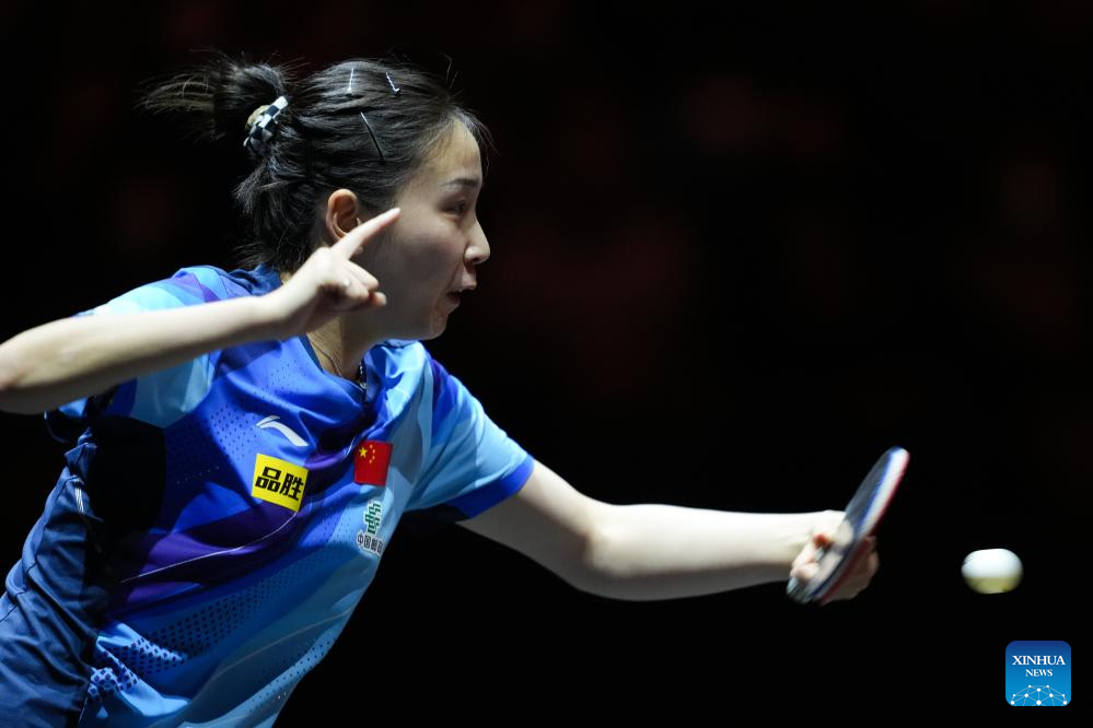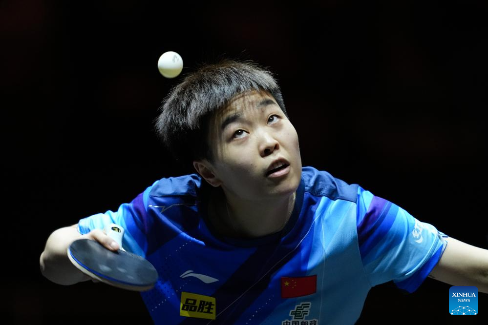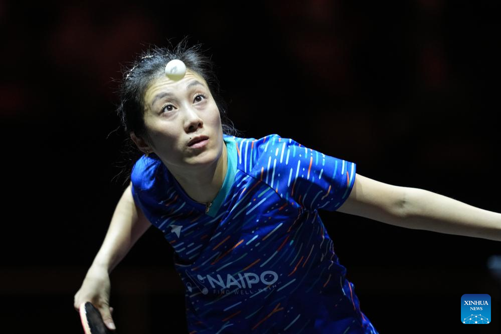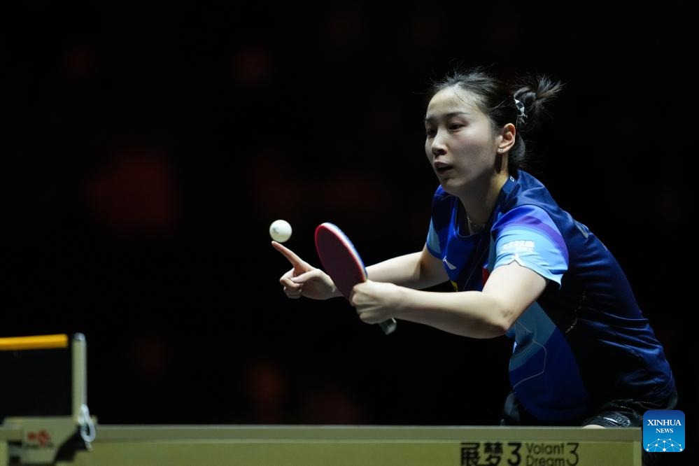 Qian Tianyi of China hits a return during the women's singles round of 16 match between Zhang Rui of China and Qian Tianyi of China at the WTT Finals Women Nagoya 2023 in Nagoya, Japan, on Dec. 15, 2023. (Xinhua/Zhang Xiaoyu)