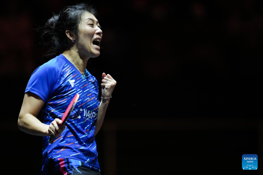 Wang Manyu of China celebrates during the women's singles round of 16 match against Yang Xiaoxin of Monaco at the WTT Finals Women Nagoya 2023 in Nagoya, Japan, on Dec. 15, 2023. (Xinhua/Zhang Xiaoyu)