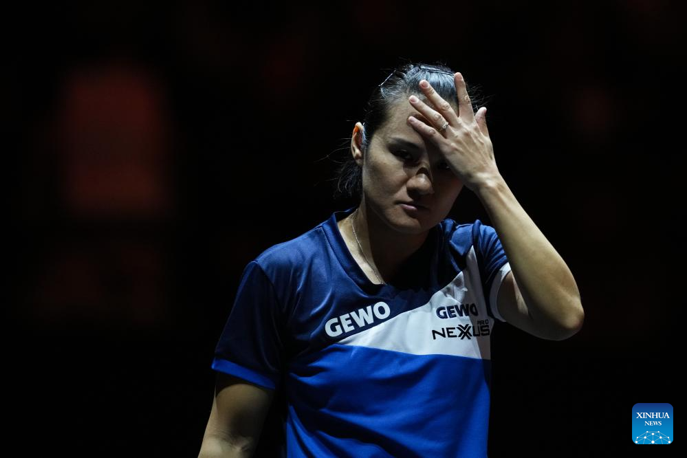 Yang Xiaoxin of Monaco reacts during the women's singles round of 16 match against Wang Manyu of China at the WTT Finals Women Nagoya 2023 in Nagoya, Japan, on Dec. 15, 2023. (Xinhua/Zhang Xiaoyu)