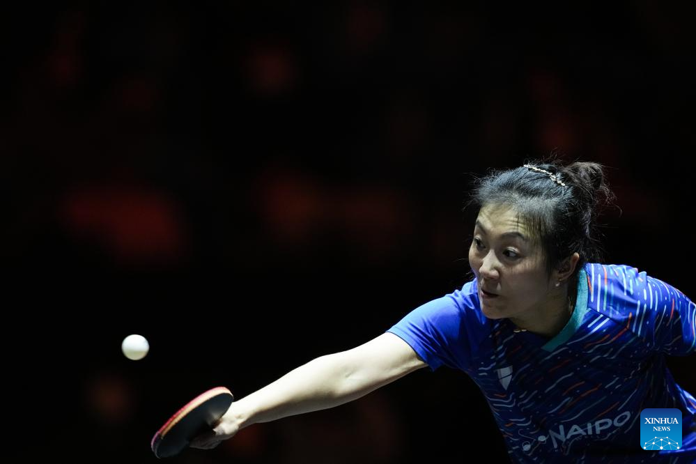 Han Ying of Germany hits a return during the women's singles round of 16 match against Joo Cheonhui of South Korea at the WTT Finals Women Nagoya 2023, in Nagoya, Japan on Dec. 15, 2023. (Xinhua/Zhang Xiaoyu)