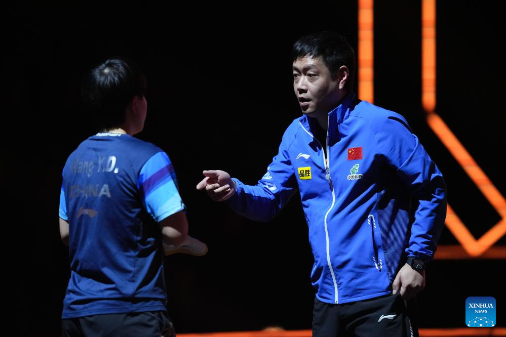 Wang Yidi (L) of China is instructed by her coach Qiu Yike during the women's singles round of 16 match against Shin Yubin of South Korea at the WTT Finals Women Nagoya 2023 in Nagoya, Japan, on Dec. 15, 2023. (Xinhua/Zhang Xiaoyu)