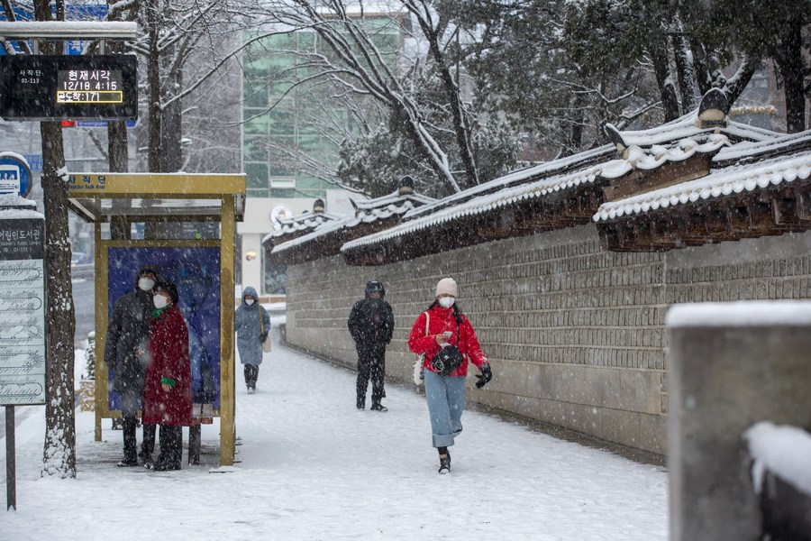 People walk in snow in a street in Seoul, South Korea, Dec. 18, 2021. (Xinhua/Wang Yiliang)