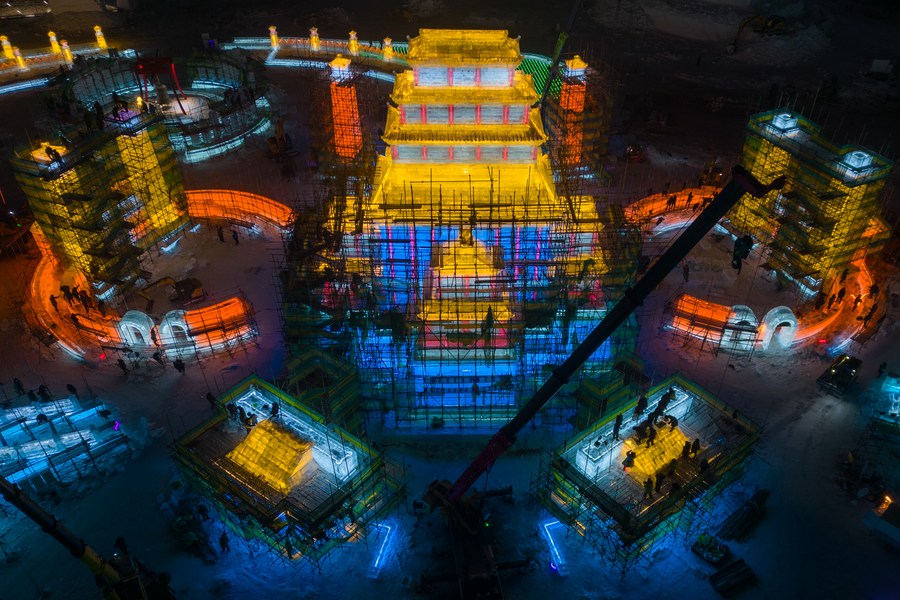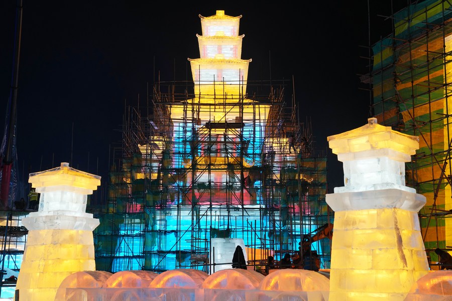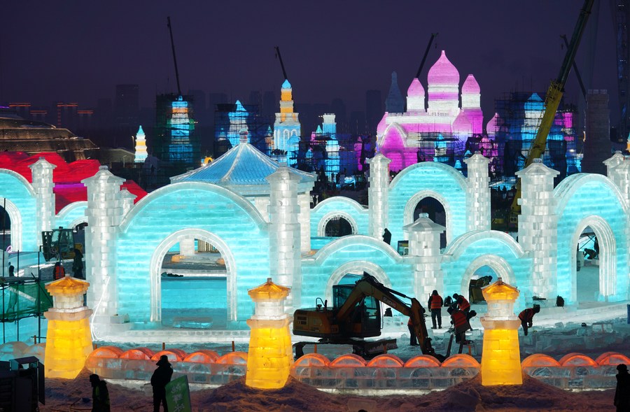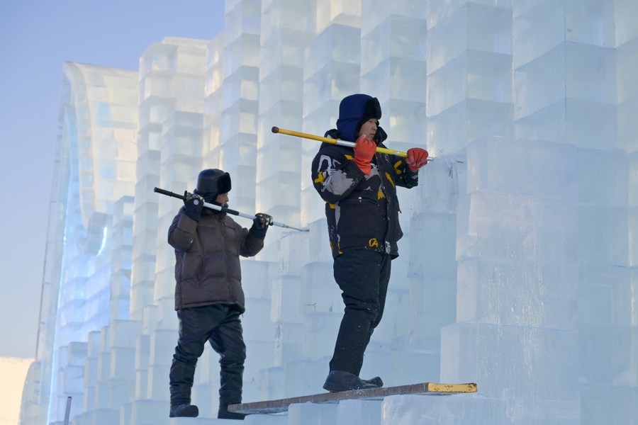 Staff members work at the construction site of the Harbin Ice and Snow World, a renowned seasonal theme park opening every winter, in Harbin, northeast China's Heilongjiang Province, Dec. 14, 2023. (Xinhua/Shi Feng)