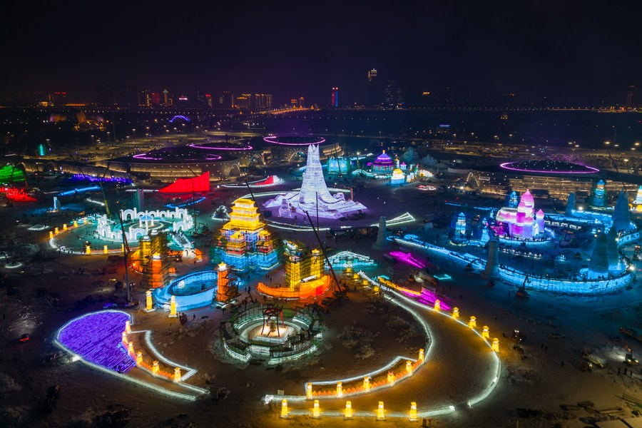 This aerial photo taken on Dec. 12, 2023 shows the construction site of the Harbin Ice and Snow World, a renowned seasonal theme park opening every winter, in Harbin, northeast China's Heilongjiang Province. (Xinhua/Zhang Tao)