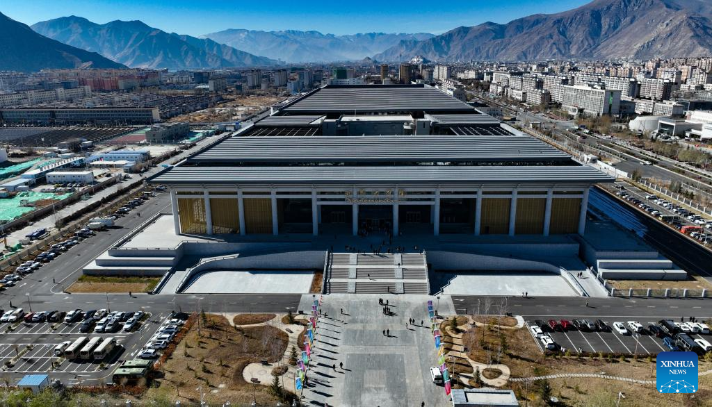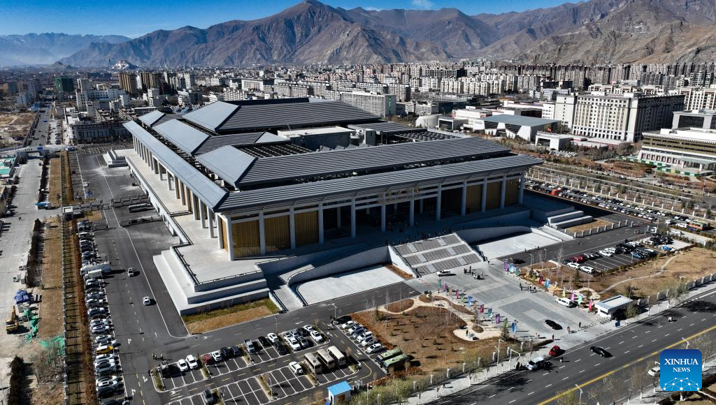 This aerial photo taken on Dec. 15, 2023 shows a view of Xizang grand theatre in Lhasa, southwest China's Xizang Autonomous Region. Xizang grand theatre became operational on Friday. (Xinhua/Jigme Dorje)