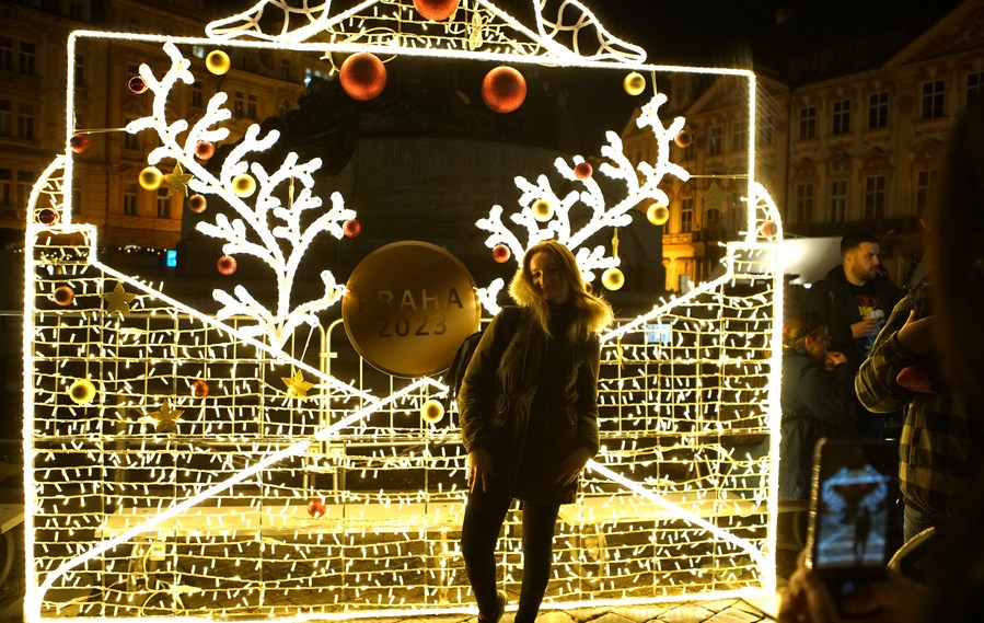 A woman poses for photos in front of a light installation at a Christmas market in Prague, the Czech Republic, on Dec. 12, 2023. (Photo by Dana Kesnerova/Xinhua)
