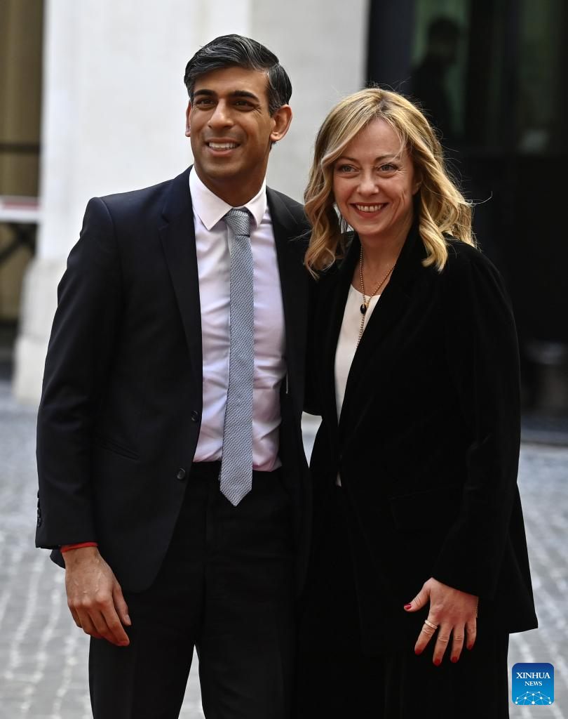 British Prime Minister Rishi Sunak (L) and Italian Prime Minister Giorgia Meloni meet at the Palazzo Chigi, the official seat of Italy's government, in Rome, Dec. 16, 2023. The leaders of Italy, Britain and Albania said in Rome on Saturday that confronting irregular immigration in Europe would require "intensified collaboration" between nations. (Photo by Alberto Lingria/Xinhua)