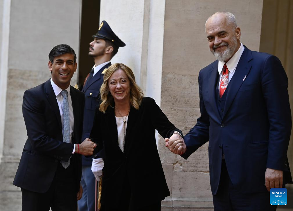 British Prime Minister Rishi Sunak (L), Albanian Prime Minister Edi Rama (R) and Italian Prime Minister Giorgia Meloni meet at the Palazzo Chigi, the official seat of Italy's government, in Rome, Dec. 16, 2023. The leaders of Italy, Britain and Albania said in Rome on Saturday that confronting irregular immigration in Europe would require "intensified collaboration" between nations. (Photo by Alberto Lingria/Xinhua)