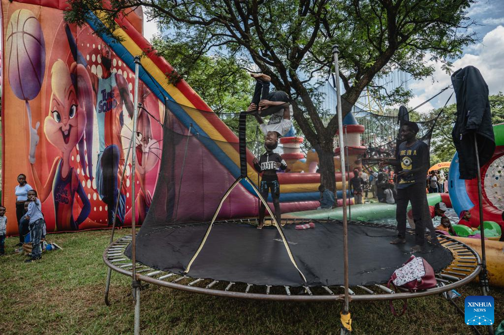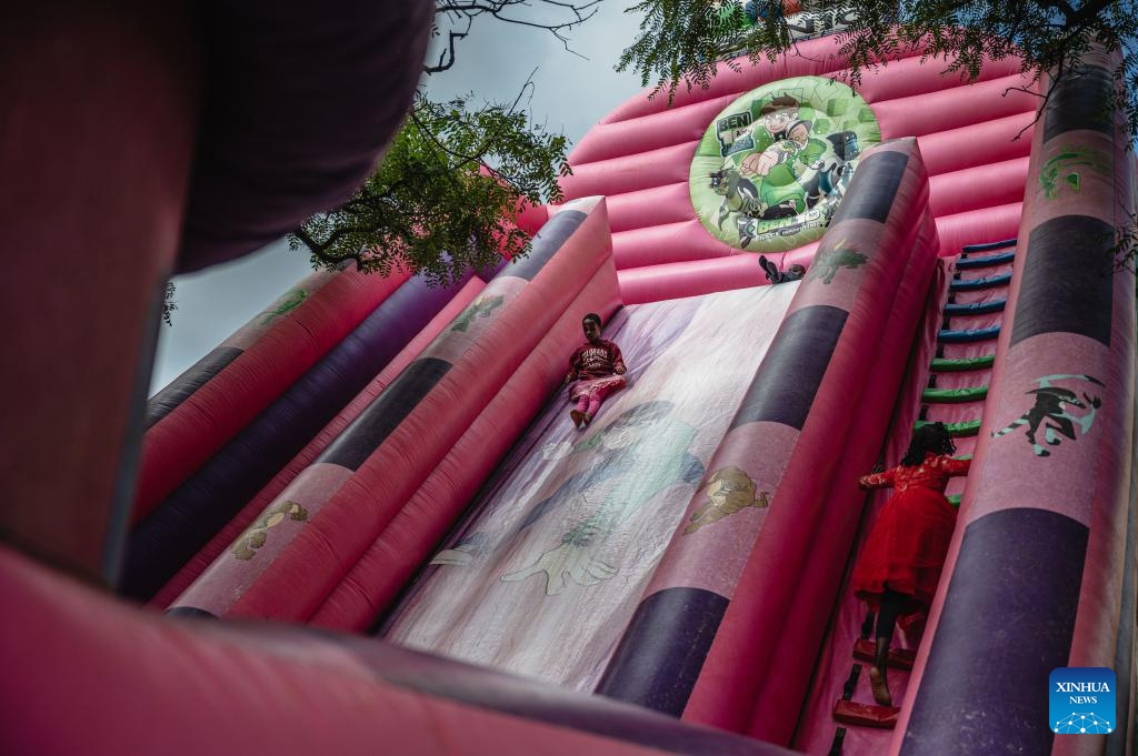 Children play on an inflatable slide at Uhuru Park in Nairobi, capital of Kenya, on Dec. 16, 2023. (Xinhua/Wang Guansen)