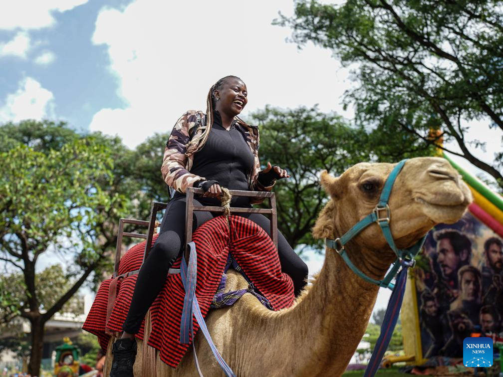 A woman rides a camel at Uhuru Park in Nairobi, capital of Kenya, on Dec. 16, 2023. (Xinhua/Li Yahui)