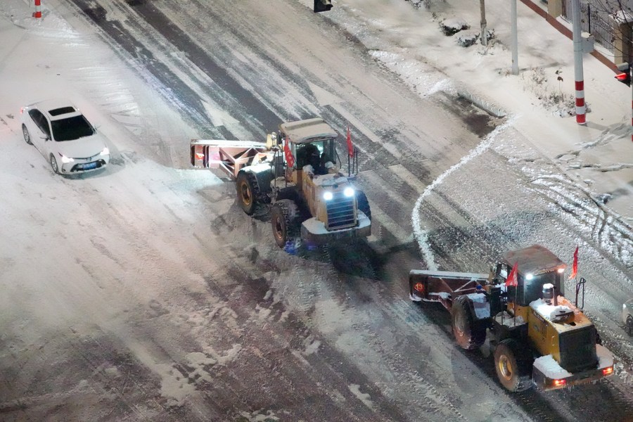 Snowplows clear snow in the street in Yantai, east China's Shandong Province, Dec. 16, 2023. (Photo by Tang Ke/Xinhua)