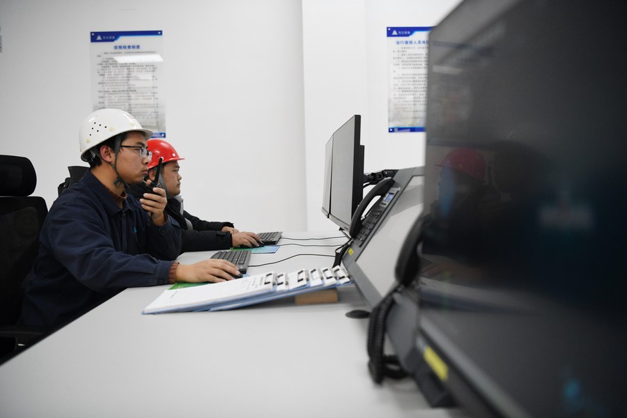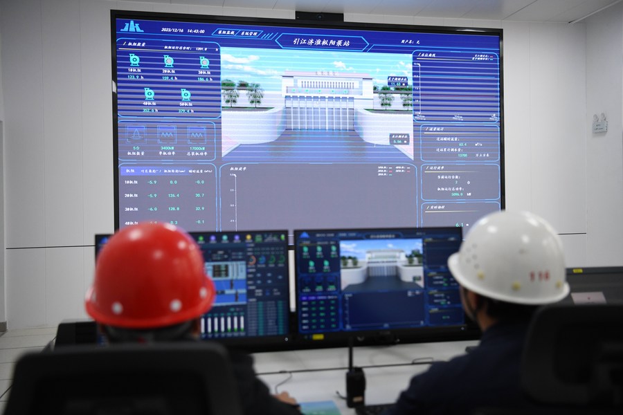Staff members work at the central control room of Zongyang pumping station in east China's Anhui Province, Dec. 16, 2023. (Xinhua/Zhang Duan)