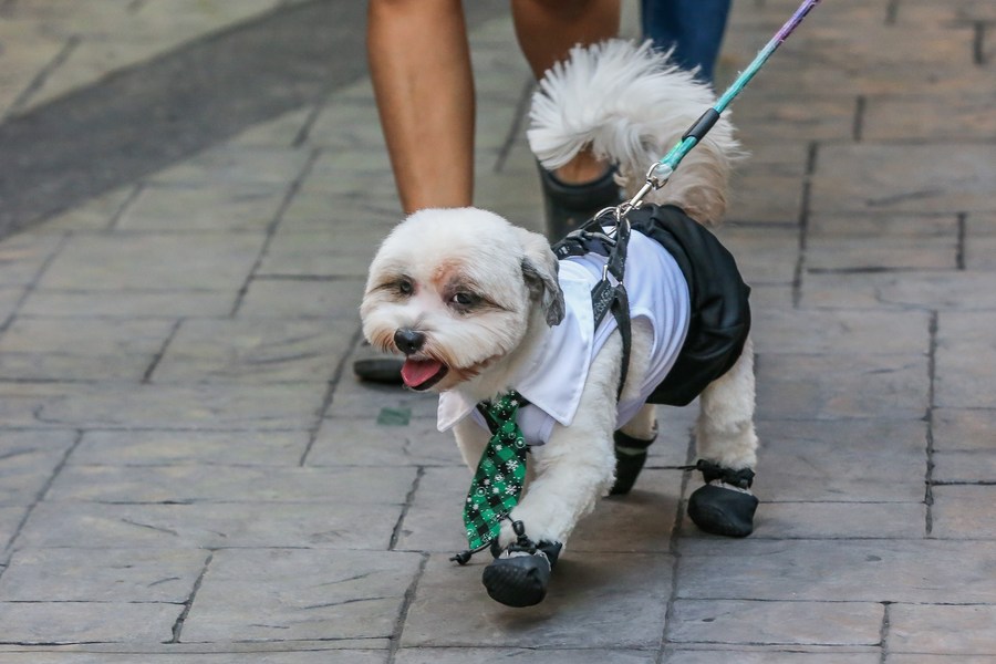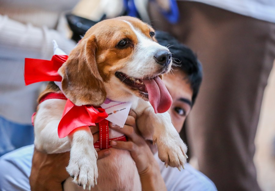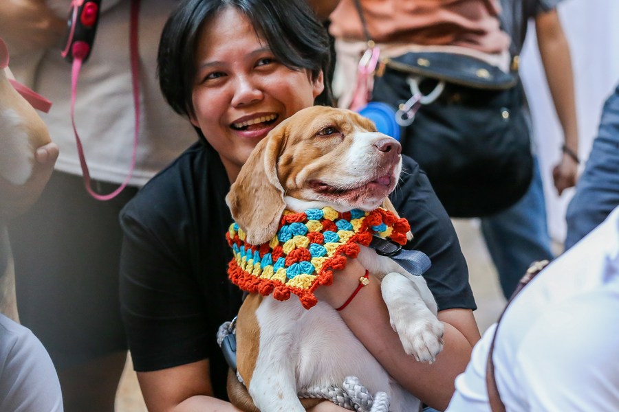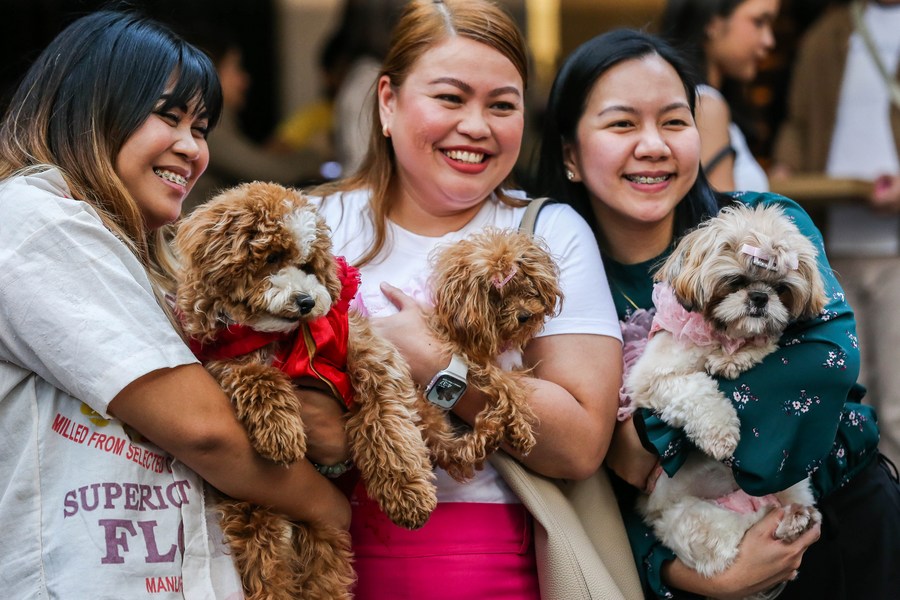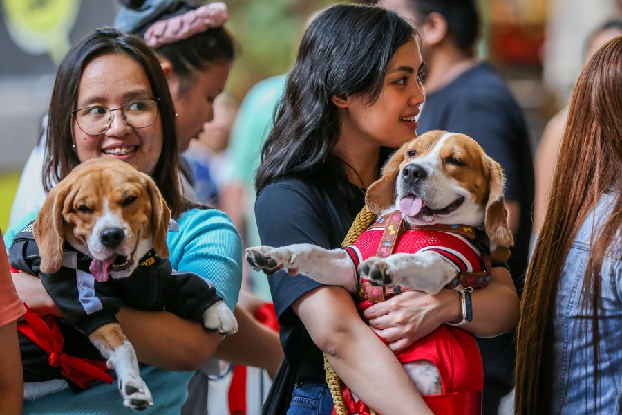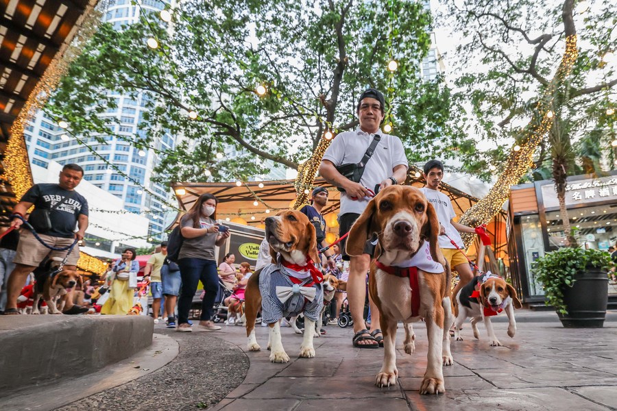 People are seen with their pets dressed in costumes during the Christmas Pet Parade at a mall in Quezon City, the Philippines, on Dec. 17, 2023. (Xinhua/Rouelle Umali)