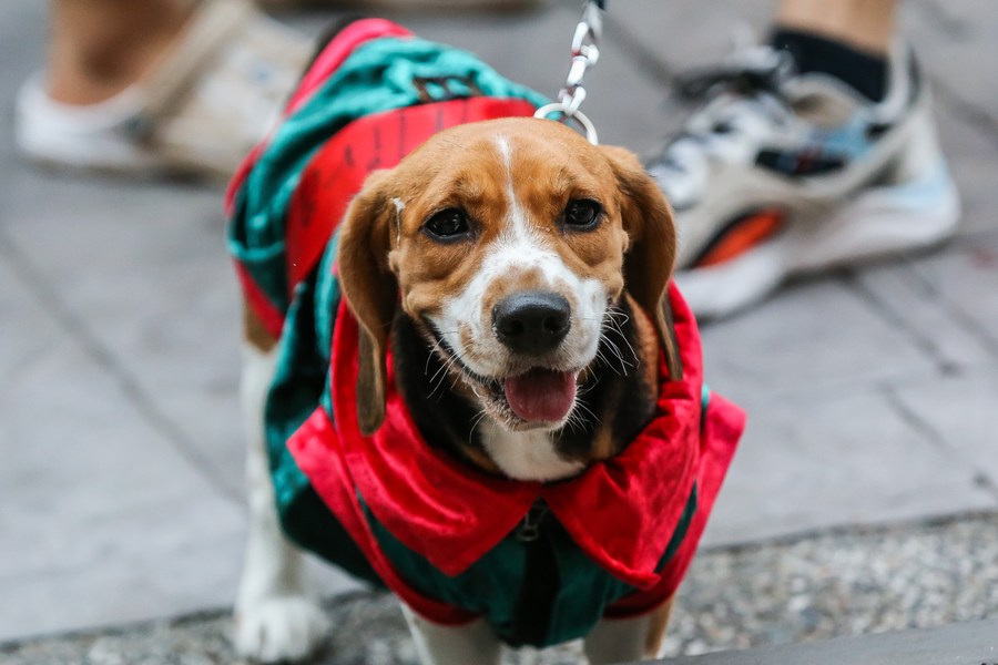 A dog dressed in a costume is seen during the Christmas Pet Parade at a mall in Quezon City, the Philippines, on Dec. 17, 2023. (Xinhua/Rouelle Umali)