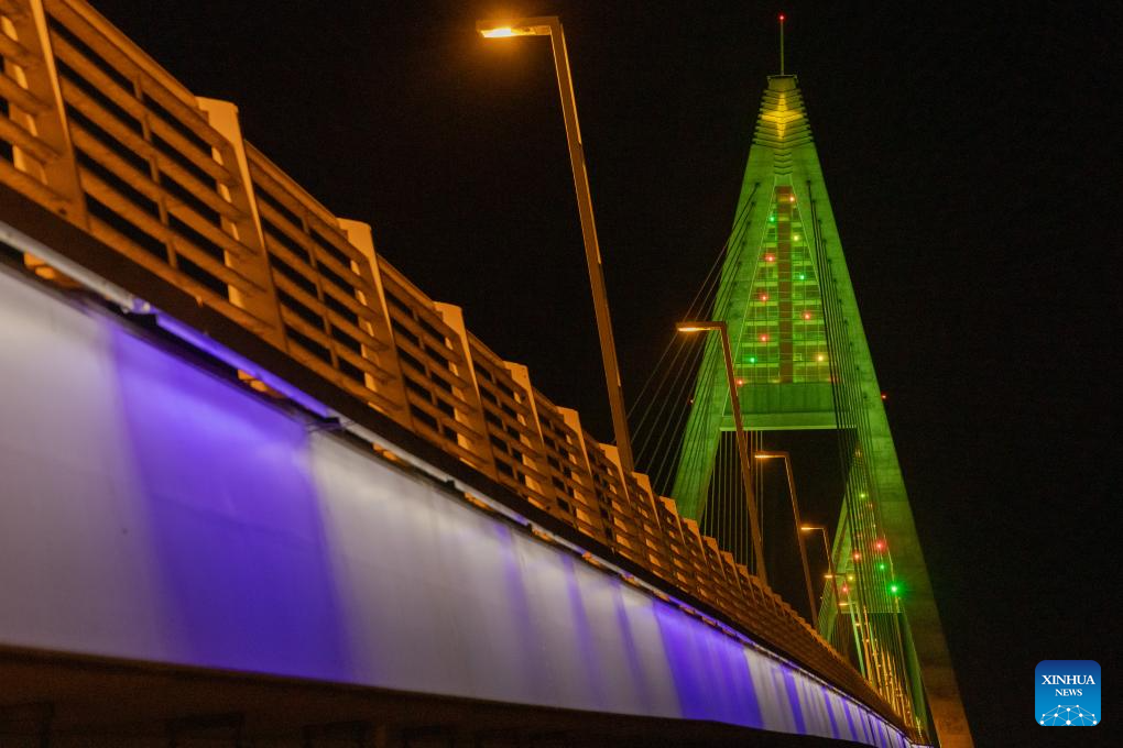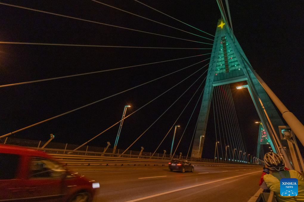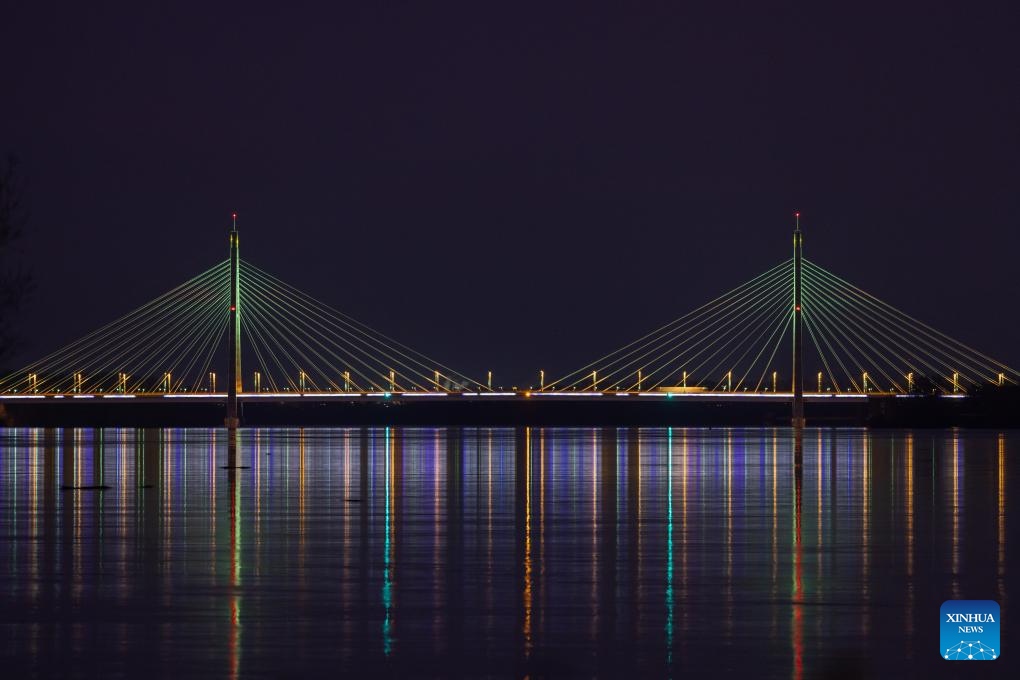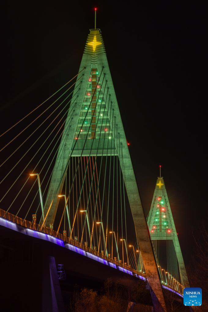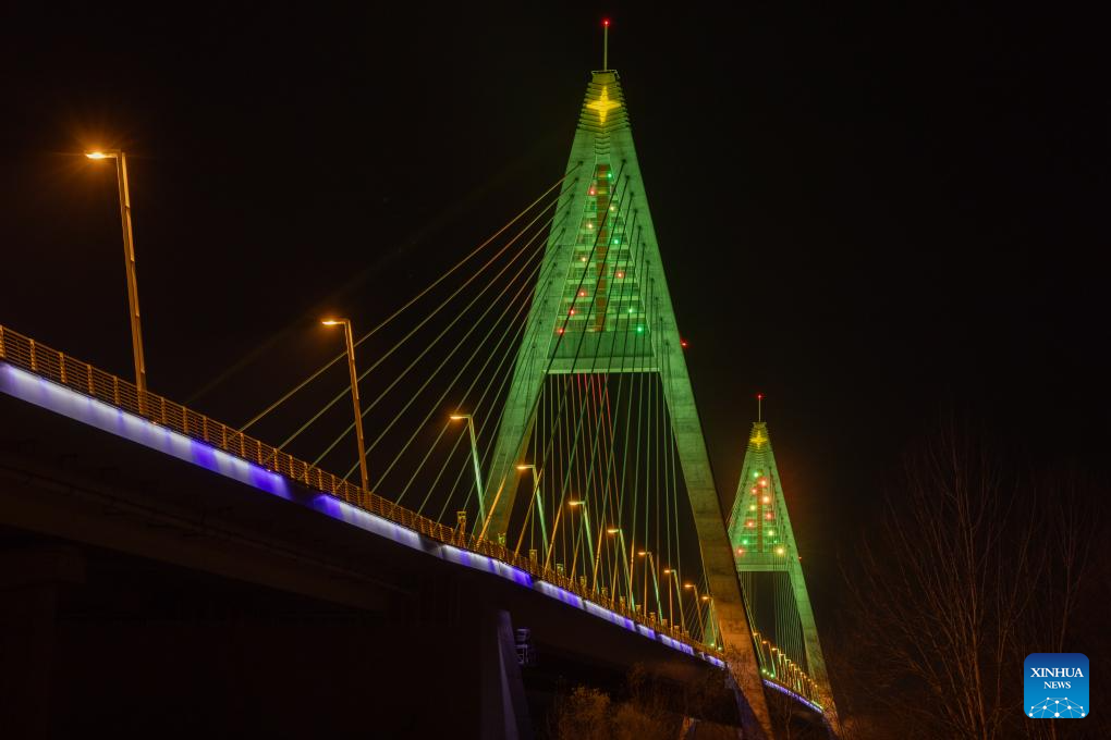 Christmas lights are pictured at the Megyeri Bridge over the Danube river in northern Budapest, Hungary on Dec. 17, 2023. (Photo by Attila Volgyi/Xinhua)