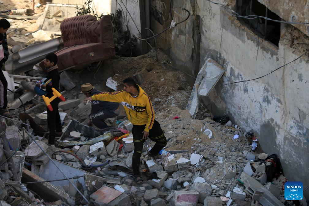 People inspect the damage after an Israeli airstrike in the southern Gaza Strip city of Rafah, on Dec. 19, 2023. The death toll of Palestinians from Israeli attacks in the Gaza Strip has risen to 19,667, and 52,586 others were wounded since Oct. 7, the Hamas-run Health Ministry said on Tuesday. (Photo by Yasser Qudih/Xinhua)