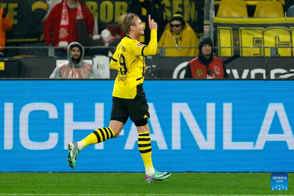 Julian Brandt of Dortmund celebrates scoring during a Bundesliga match between Borussia Dortmund and FSV Mainz 05 in Dortmund, Germany, Dec. 19, 2023. (Photo by Joachim Bywaletz/Xinhua)