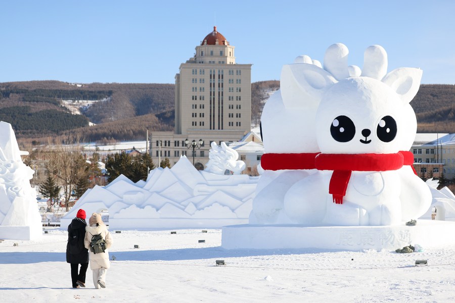 Visitors are seen at a snow sculpture park in Arxan of Hinggan League, north China's Inner Mongolia Autonomous Region, Dec. 14, 2023. (Xinhua/Wang Kaiyan)