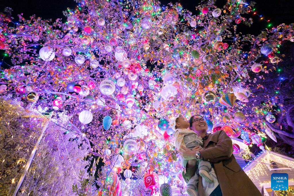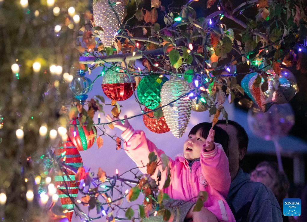 A girl watches Christmas decorations at a community in San Carlos, California, the United States, Dec. 19, 2023. (Photo by Li Jianguo/Xinhua)