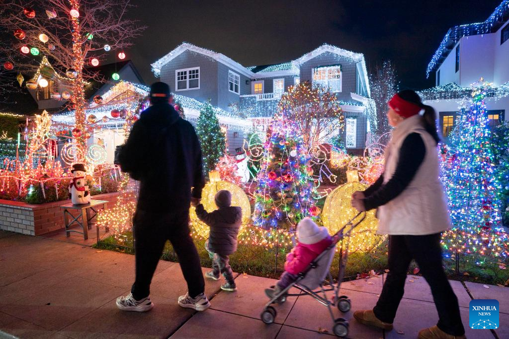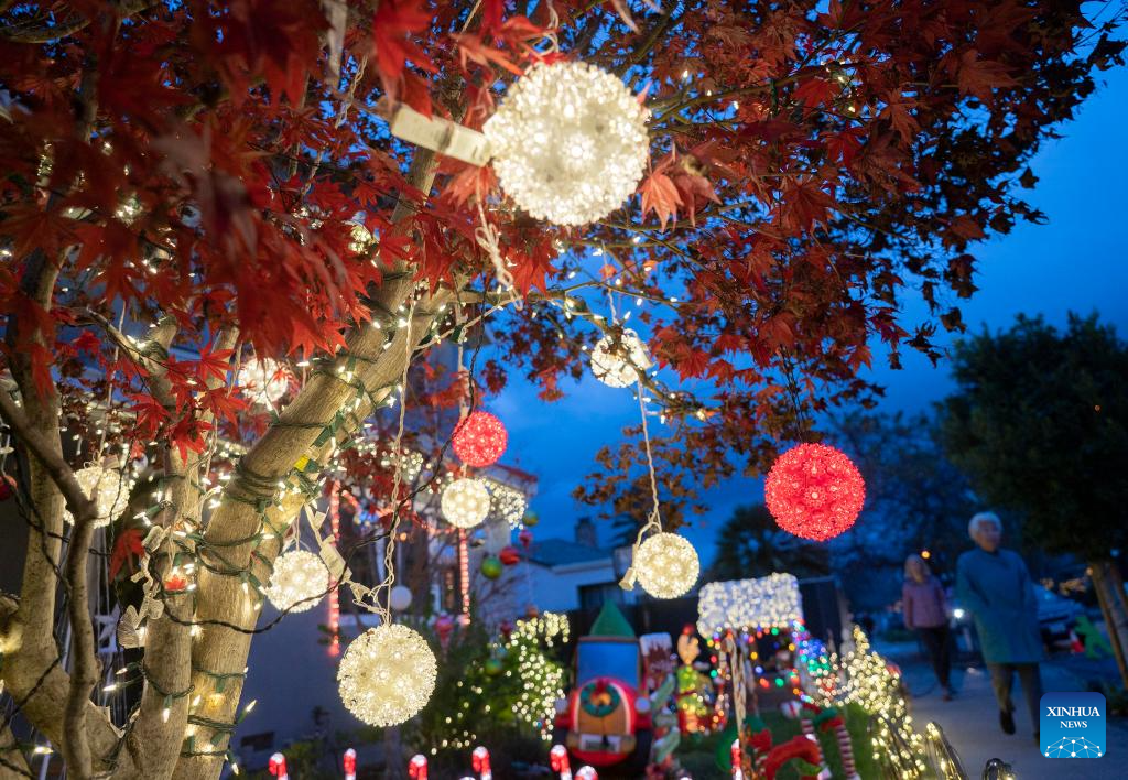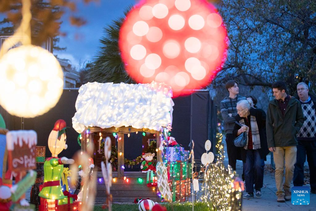 People watch Christmas decorations at a community in San Carlos, California, the United States, Dec. 19, 2023. (Photo by Li Jianguo/Xinhua)