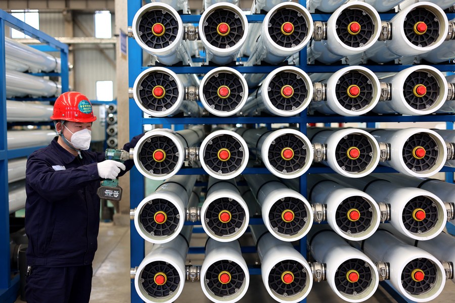 An employee works at a company producing water treatment equipment in Huimin County of Binzhou, east China's Shandong Province, March 14, 2023. (Photo by Chu Baorui/Xinhua)