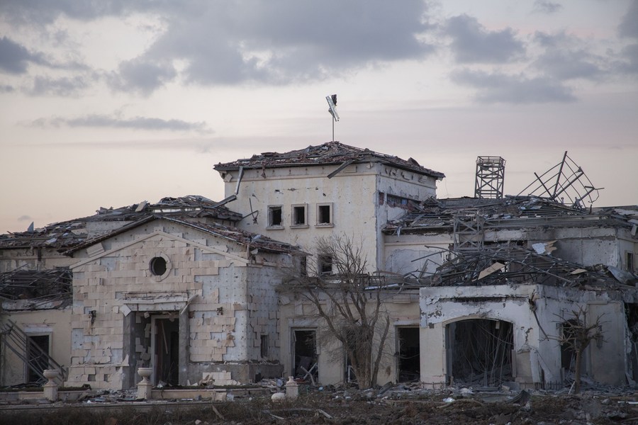 Photo taken on March 13, 2022 shows buildings damaged due to the missile attack near the U.S. consulate compound in Erbil, Iraq. (Photo by Dalshad Al-Daloo/Xinhua)