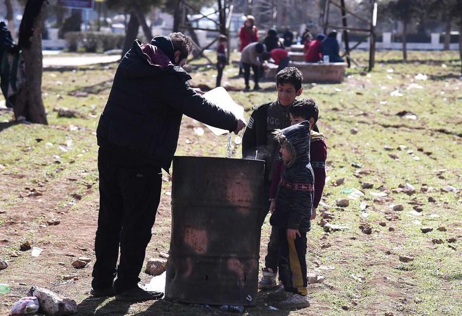 Displaced children are seen at a public park in Aleppo, Syria, on Feb. 16, 2023. (Str/Xinhua)