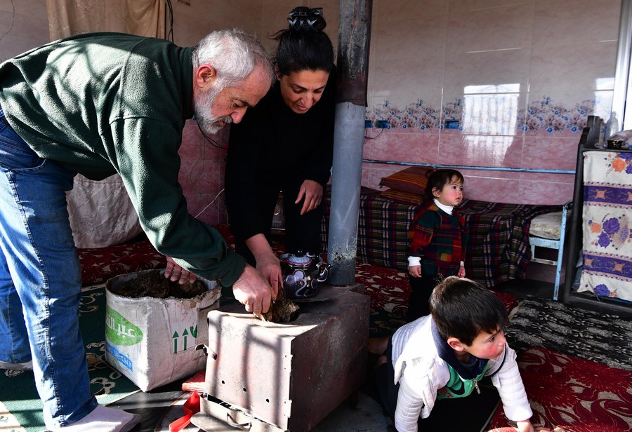 Al-Muthana Hasan al-Shoufi, 53, and his family use cow dung as heating fuel in Sweida, Syria, on Jan. 23, 2022. (Photo by Ammar Safarjalani/Xinhua)