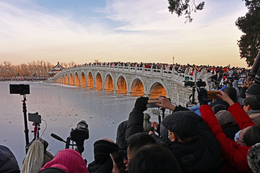 Visitors take pictures of the Seventeen-Arch Bridge with the sunset glow shining through its arches at the Summer Palace in Beijing, capital of China, Dec. 22, 2023. (Xinhua/Li Xin)