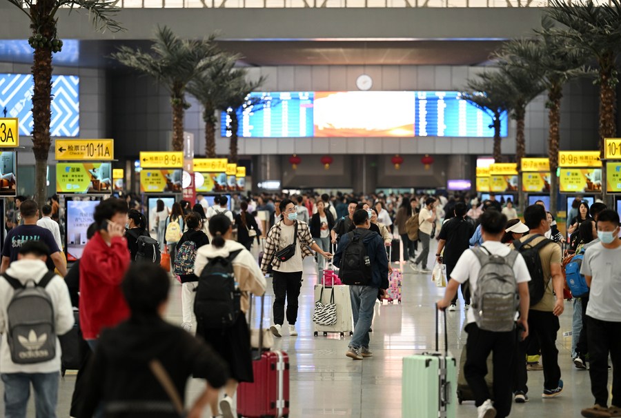 Travelers are seen in the waiting hall of Tianjin Railway Station in north China's Tianjin Municipality, Oct. 6, 2023. (Xinhua/Zhao Zishuo)