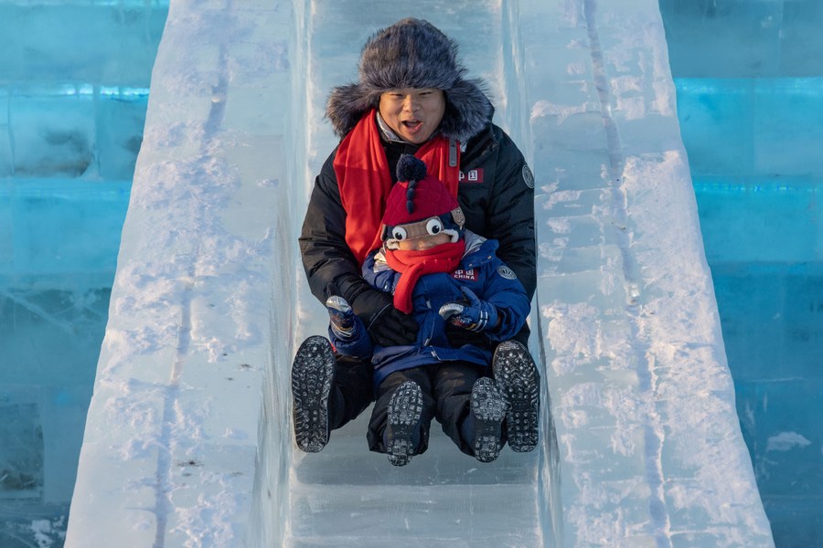 Tourists have fun at the Harbin Ice-Snow World in Harbin, northeast China's Heilongjiang Province, Dec. 18, 2023. (Xinhua/Xie Jianfei)