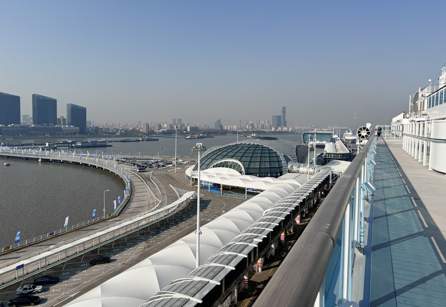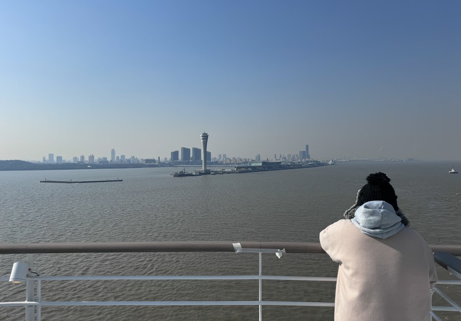 A passenger aboard the cruise ship "Adora Magic City" looks back as the ship departs from the Shanghai Wusongkou International Cruise Terminal in east China's Shanghai, Dec. 24, 2023. (Xinhua/Ding Ting)