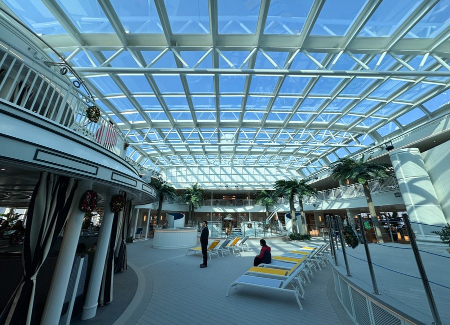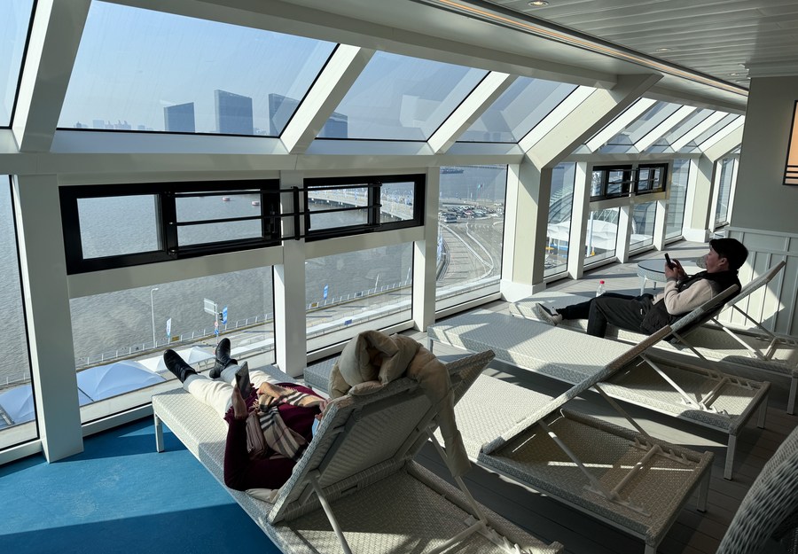 This photo taken on Dec. 24, 2023 shows an interior view of the cruise ship "Adora Magic City" docked at the Shanghai Wusongkou International Cruise Terminal in east China's Shanghai. (Xinhua/Ding Ting)