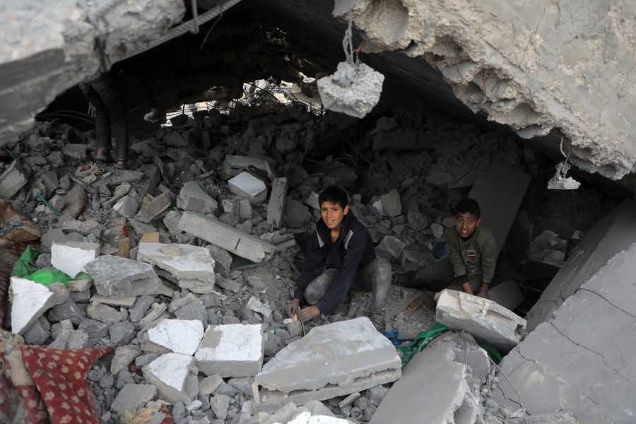 Children are pictured in building ruins after an Israeli airstrike in the southern Gaza Strip city of Khan Younis, on Dec. 23, 2023. (Photo by Rizek Abdeljawad/Xinhua)
