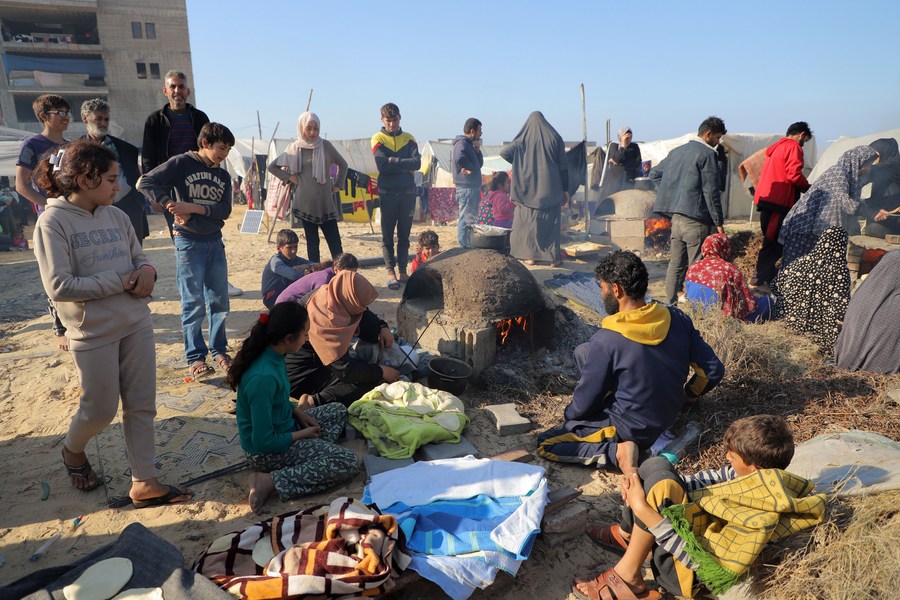 Displaced Palestinians prepare food at a temporary shelter in the southern Gaza Strip city of Rafah, on Dec. 18, 2023. (Photo by Rizek Abdeljawad/Xinhua)