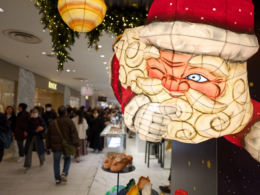 This photo taken on Dec. 24, 2023 shows Christmas-themed products in a mall in Ginza, Tokyo, Japan. (Xinhua/Zhang Xiaoyu)