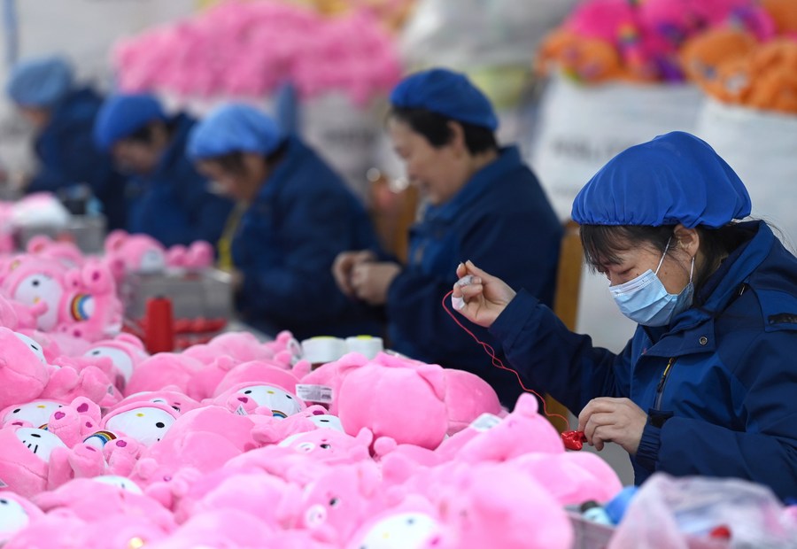 Staff members of Ankang Heng'an Toy Ltd., work at a workshop in Ankang, northwest China's Shaanxi Province, Dec. 21, 2023.(Xinhua/Zou Jingyi)