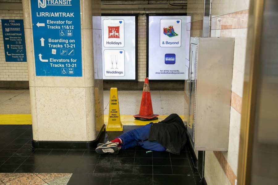 A homeless person is pictured at a subway station in New York, the United States, Dec. 23, 2023. (Photo by Michael Nagle/Xinhua)