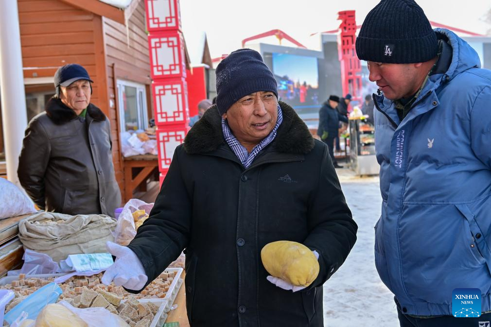 A villager introduces farm produce to a visitor at Akwutkel village in Fuhai County of Altay Prefecture, northwest China's Xinjiang Uygur Autonomous Region, Dec. 21, 2023. (Xinhua/Ding Lei)