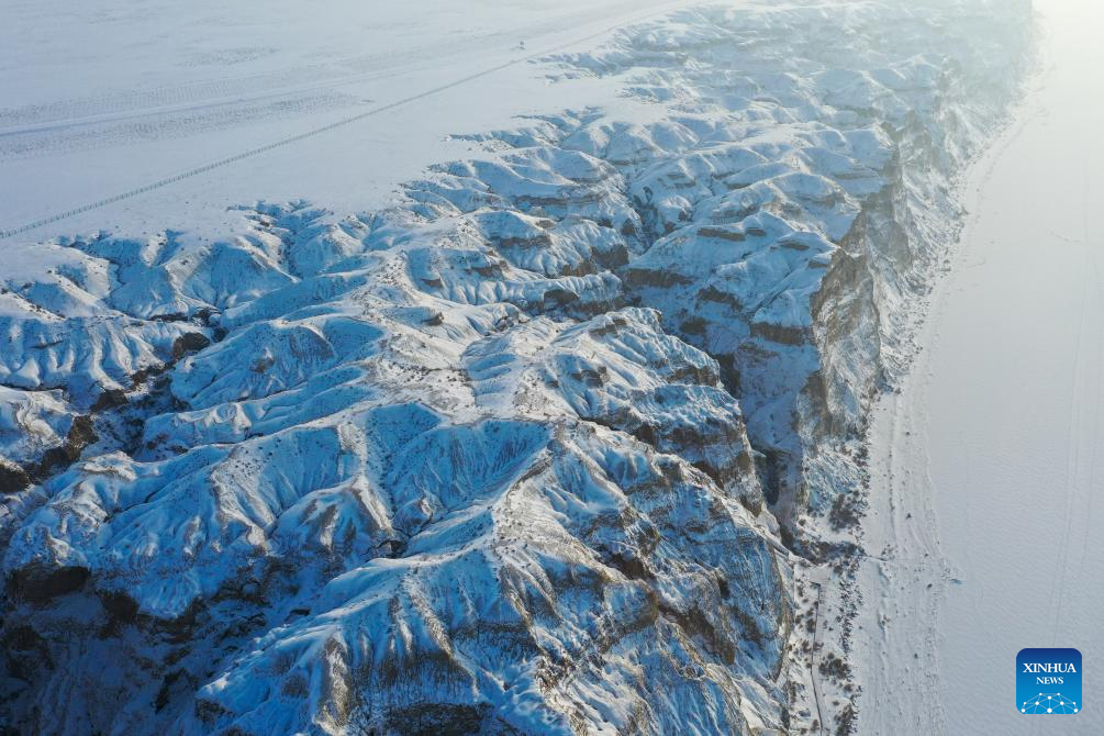 This aerial photo taken on Dec. 21, 2023 shows a scenic spot along the Ulunggur Lake in Fuhai County of Altay Prefecture, northwest China's Xinjiang Uygur Autonomous Region. (Xinhua/Ding Lei)